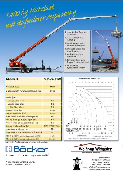 Böcker Anhängerkran 30/1400 - Wir bieten einen Kranservice (nur mit Bedienpersonal) für Firmen und Privatpersonen Preise und sonstige Details können Sie telefonisch bei uns erfahren ![]() ![]() ![]() |